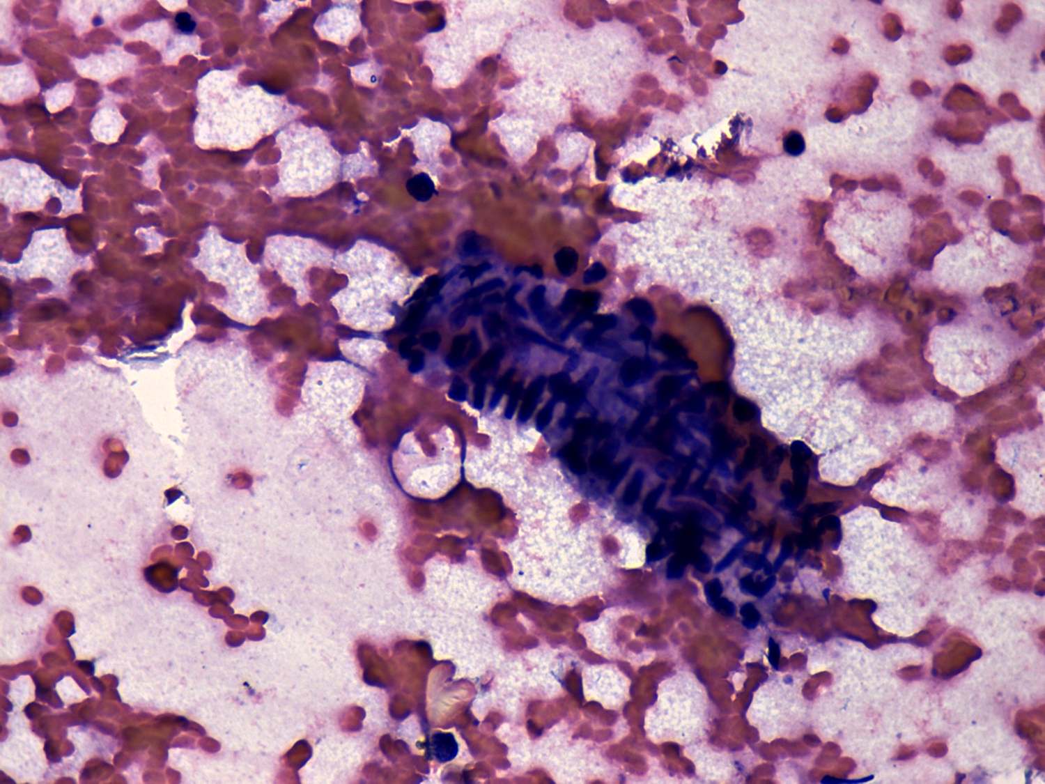 Pap-smear, 400x. Elongated cells form an irregular cluster resembling that seen in colon carcinoma.
