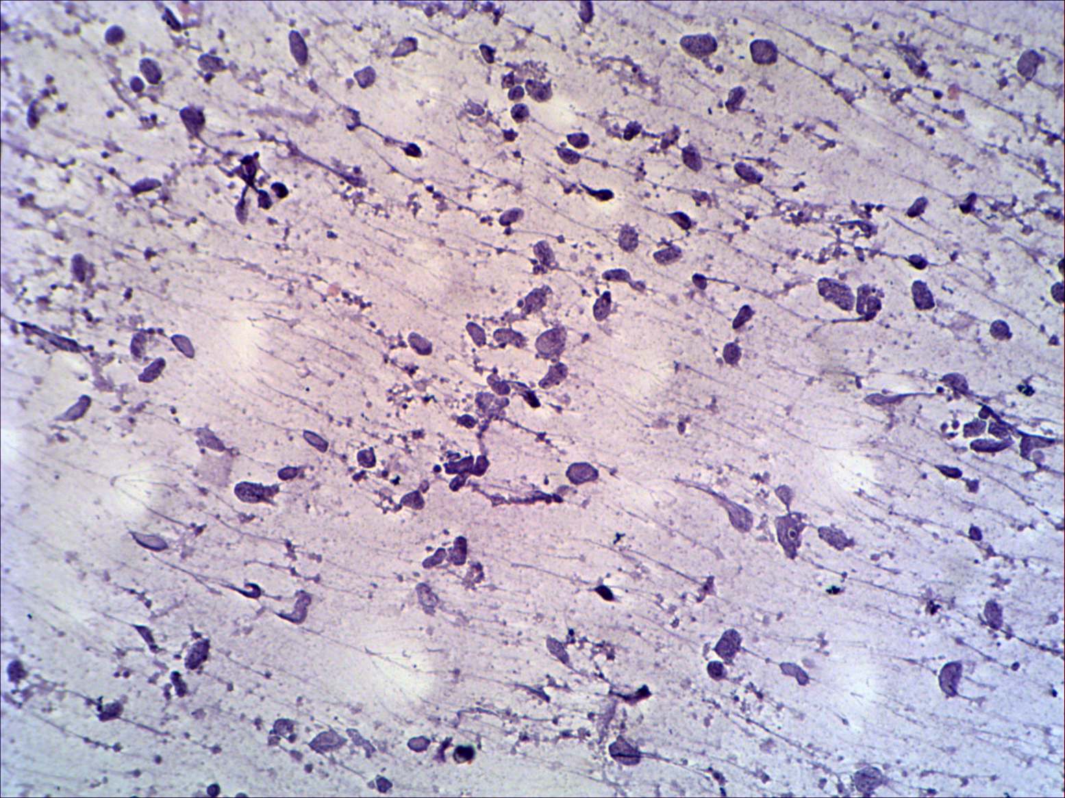 Pap-smear, 200x. There are enlarged and elongated atypical, pleomorphic dissociated tumor cells.