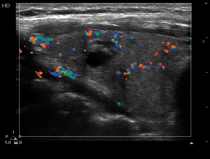 Ultrasonography. The thyroid was echonormal and contained several cystic areas and an echonormal nodule in the right lobe. There was a large, partly echonormal, partly hypoechogenic nodule in the left lobe. This lesion had irregular borders and presented an irregularly increased intranodular vascularization.