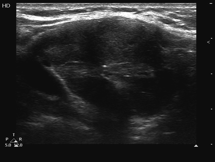 Clinical data: A 69-year-old woman was referred for evaluation of a thyroid nodule which was detected on evaluation performed because of 10 kg weight loss-up and diarrhea. Her complaints lasted for three months. Various gastroenterological examinations were performed but the cause for complaints was not revealed. The patient was diagnosed as having Hashimoto's thyroiditis for several years. She got no thyroid medication. The patient noticed a lump in the left side of the neck for 5 months. Otherwise, she had no complaints.