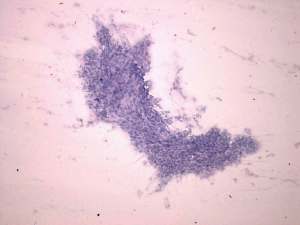 Cytology resulted in carcinoma corresponding to an anaplastic cancer. Thyroglobulin immunostaining was negative.