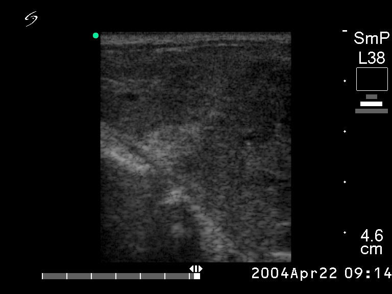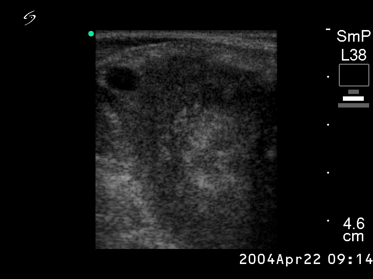 Ultrasonography. A large, hypoechogenic mass occupied almost the entire right lobe. The tumor spread substernal.