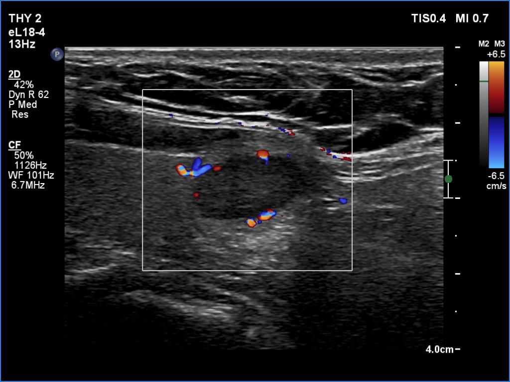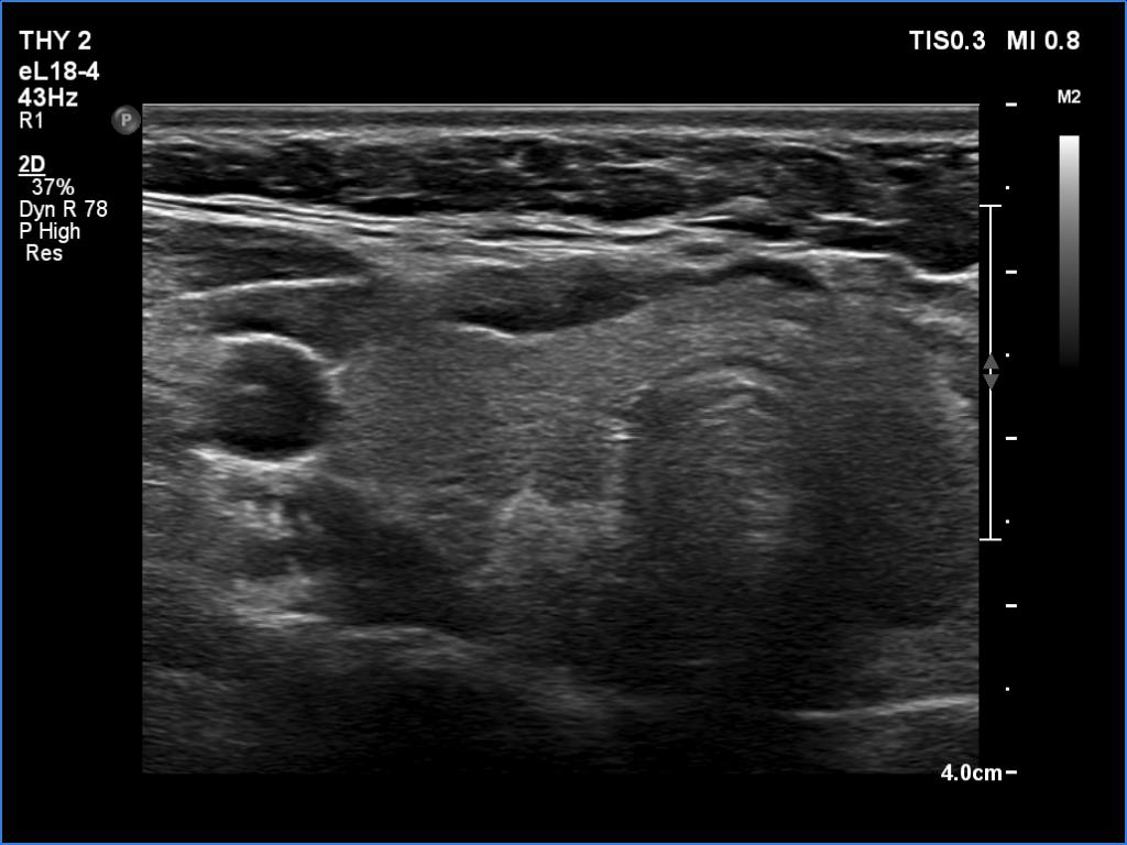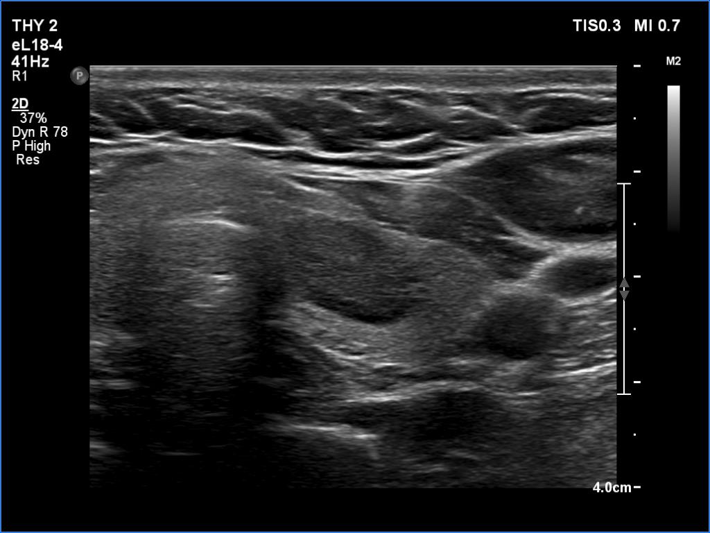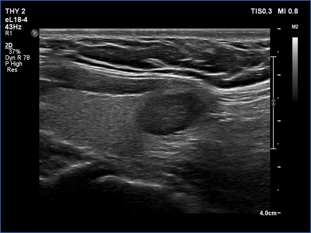 Ultrasonography. The thyroid was echonormal. There was a moderately hypoechoic lesion in the lower pole of the right lobe. The lesion presented no suspicious findings.
