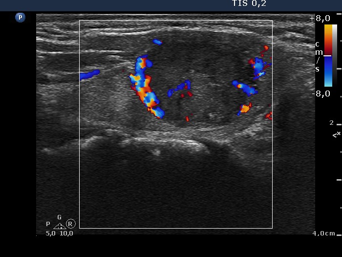 Right lobe, longitudinal scan, color Doppler mode. The lesion has perinodular and increased intranodular blood flow.