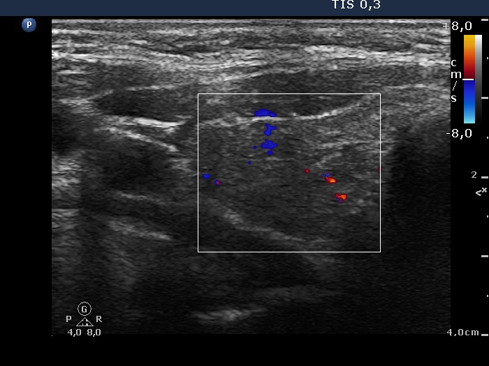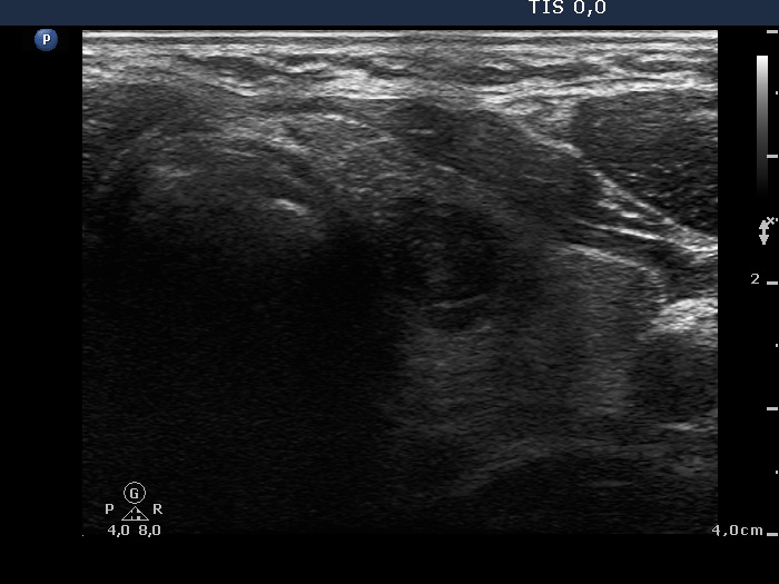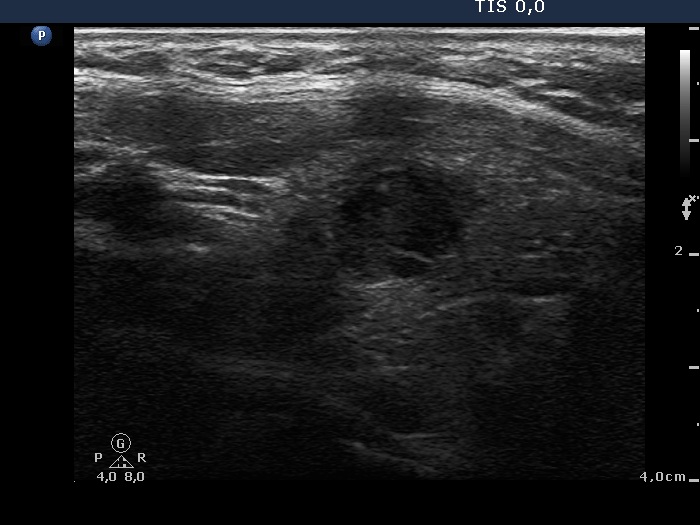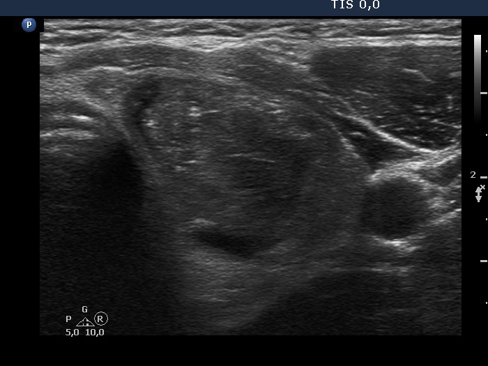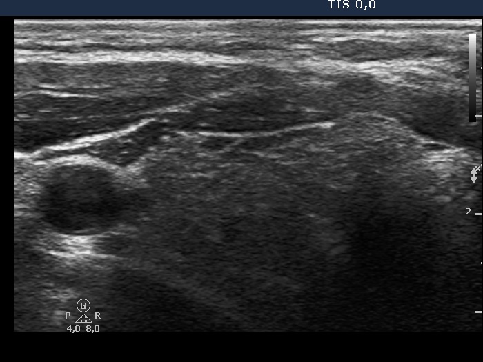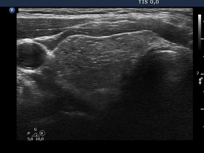 Ultrasonography. The presentation of the thyroid was essentially the same as 7 years ago. The only discrepancy was the lesion in the left lobe. Firstly, the size of the lesion have substantially increased to 25x18x25 mm (width, depth, and length, respectively), the volume was 5.89 mL which means that the volume became almost 8-times larger. Secondly, it was no more question whether the lesion was a pathological nodule or not. It turned out that this lesion is clearly a pathological nodule. Thirdly, in contrast to the former examination, the nodule has numerous microcalcifications and showed a clearly irregular, lobulated margins.