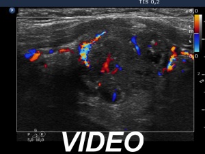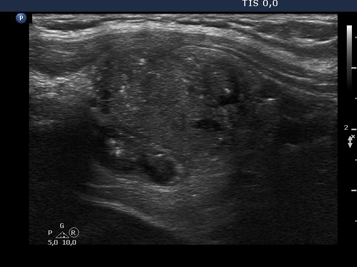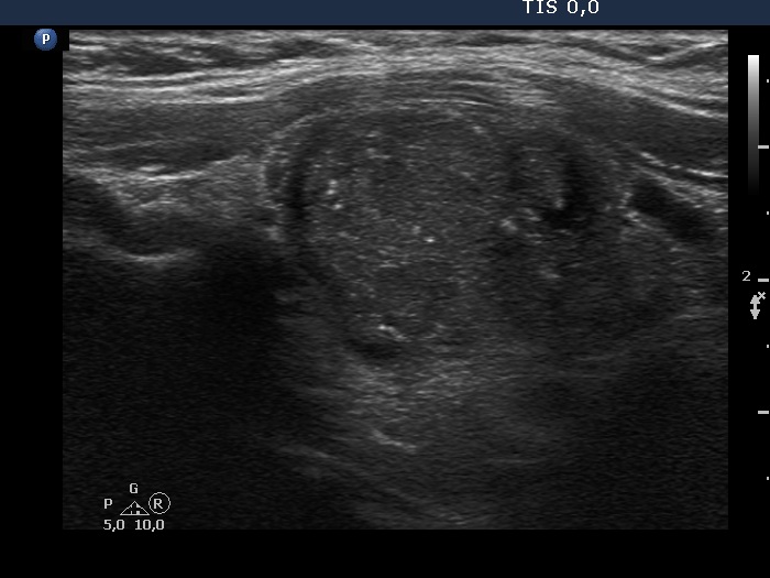 Ultrasonography. The thyroid was moderately hypoechogenic and displayed fibrosis. There was a relatively larger hypoechogenic lesion in the central part, and other smaller ones in the dorsal part of the left lobe. The dimensions of the largest lesion were 11x10x13 mm (width, depth, and length, respectively), the volume was 0.75 mL. The vascularization was not specific.
