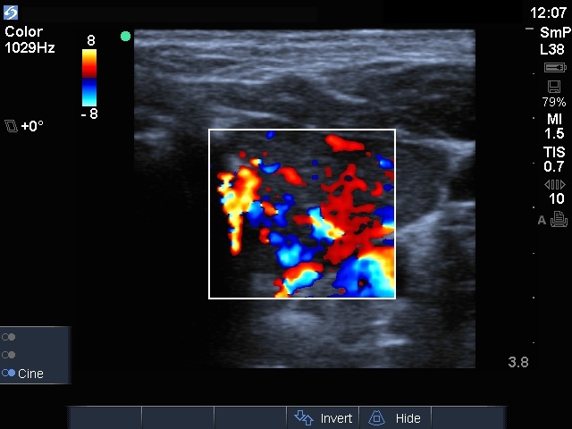 Compare the two series of pictures. The clinical presentation was almost the same in these two cases. Patients were referred for an evaluation of clinical and biochemical hyperthyroidism. The FT4 level was more than double of the upper normal limit in both cases. Patients had neither pain or tenderness, nor subfebrility or fever, nor eye complaints. The only difference was the ultrasonographic pattern. The patient with Graves' disease had diffuse hypoechogenicity and substantially increased thyroid blood flow. However, the patient with de Quervain's thyroiditis had a patchy hypoechogenic pattern and decreased blood flow. |
