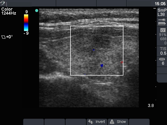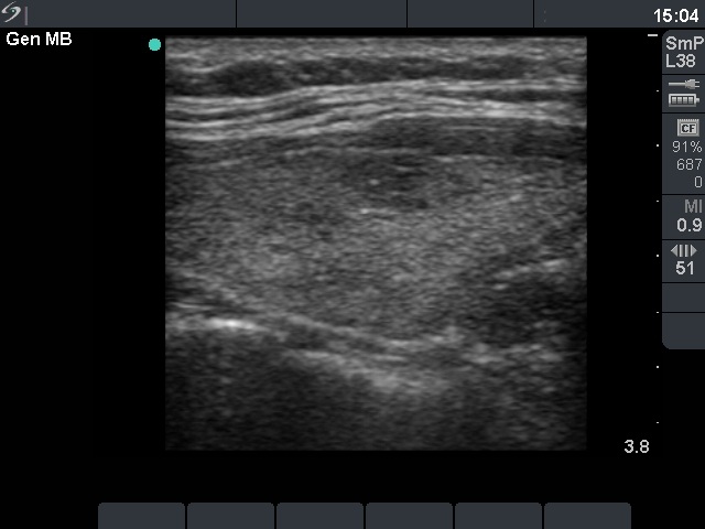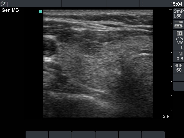 Compare the two series of pictures. Hashimoto's thyroiditis frequently has a similar appearance as observed in the case of de Quervain's thyroiditis. The patchy appearance i.e. hypoechogenic areas within an echonormal background is observed in around 70% of the former, while in more than 90% of the latter disease. In contrast with subacute thyroiditis, the hypoechogenic areas in most of the Hashimoto's cases have irregular but sharp borders. In the cases demonstrated above, the only difference between the ultrasound appearance is the pattern of the hypoechogenic areas. These foci are more blurred in the case of subacute thyroiditis. Nevertheless, the sonographic pattern itself is not diagnostic. |