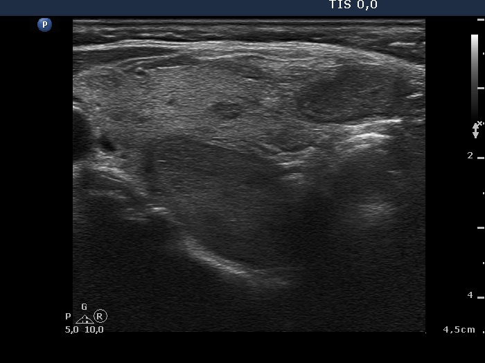 The ultrasound differentiation of a parathyroid lesion located in the surface of the thyroid from a thyroid nodule is generally not possible. The location of the masses presented here are similar. The only important difference is that the thyroid contains another nodule with identical echogenicity in the event of hyperplastic nodule case. |