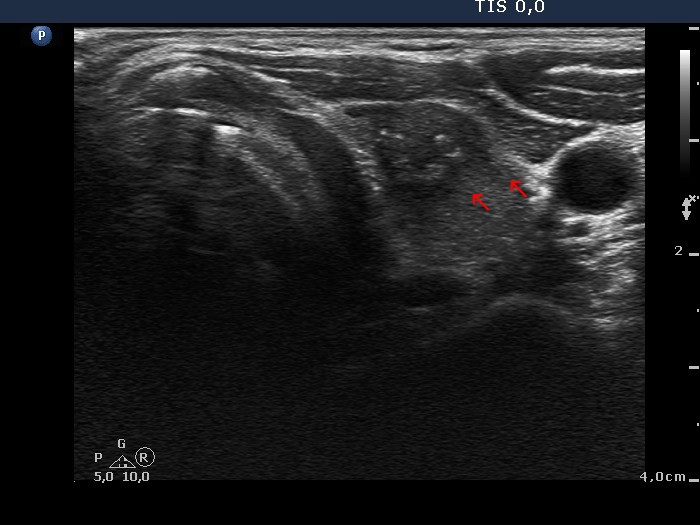 The lesion has partly blurred and partly spiculated margins. Although this presentation corresponds to thyroiditis, the fact that there are one or two relatively large lesions in the lobe should raise the possibility of nodular origin, namely papillary carcinoma. (Three types of indistinct borders are presented in these images. Green arrows point to that part of the nodule which echogenicity is identical to the extrathyroidal strap muscle. The tumor has partly blurred (red arrows) and partly spiculated (yellow arrows) margins. The extent of blurred part of the border exceeds 50%.)