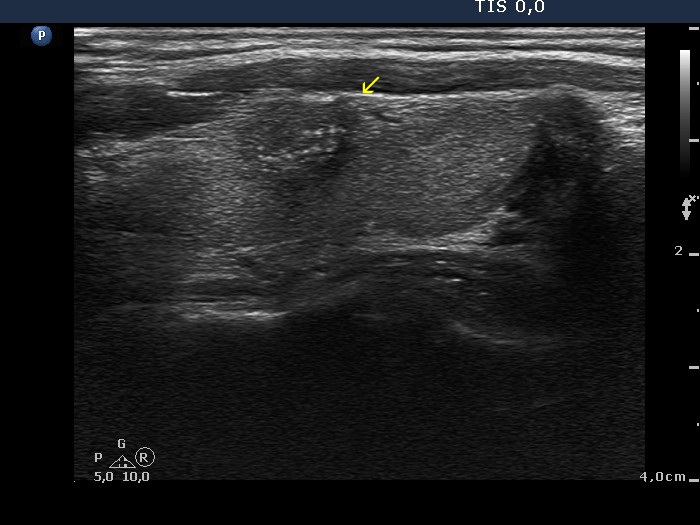 In both cases there is an echonormal area composed of multiple lesions within a hypoechoic background. Although the echonormal lesions seemingly present lobulated margins, the cause of these protrusions might differ from the usual lobulation of a nodule. In Hashimoto's thyroiditis it is a reasonable assumption that not the isoechoic lesion, but the underlying thyroiditis is the infiltrative process, and in fact not the echonormal lesion presents lobulations but the underlying thyroiditis infiltrates the isoechoic part making the surface of the latter lobulated. In other words, the isoechoic projections (red arrows) are secondary to the 'obulations' or 'spiculations' of the thyroiditis (yellow arrows).