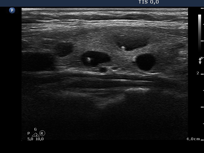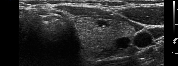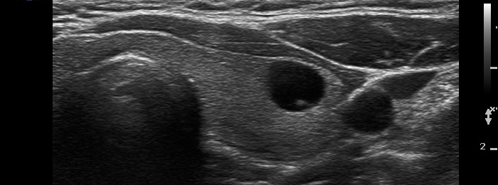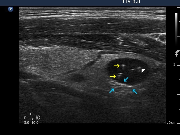 The figure marked with white double arrow is ambiguous because of the lack of dorsal tail. This figure is composed of two granules which might be two punctate echogenic foci. However, there are typical forms of comet-tail artifacts, the presence of which makes it very likely that the equivocal figures are also comet-tail artifacts. Moreover, these are within cystic fluid which theoretically excludes that these might be pathognomic microcalcifications. In addition to it is worth analyzing the dorsal wall of the cyst and the thyroid parenchyma dorsal to the nodule, both have hyperechogenic figures corresponding to a posterior back wall enhancement.