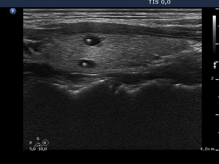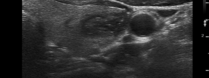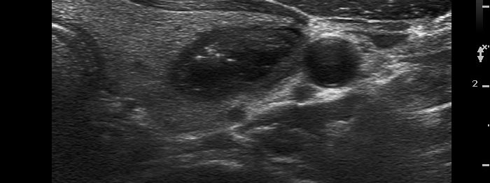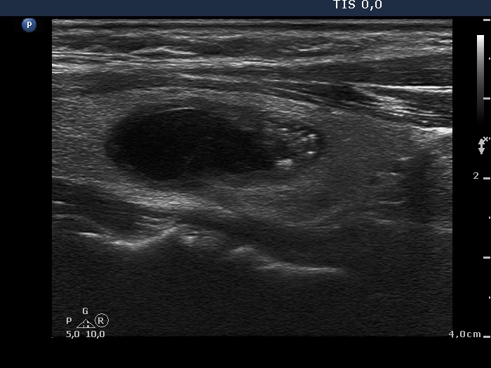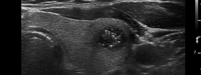 There are numerous hyperechogenic granules in the lower pole of the nodule. These figures might be confused with punctate echogenic foci (microcalcifications), as happened in this case. However, several have dorsal tail and therefore the remaining without a tail likely belong also to the same subgroup.