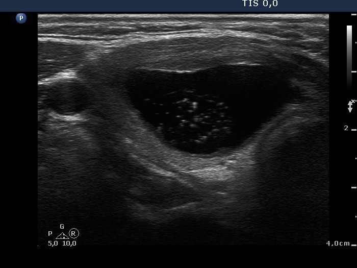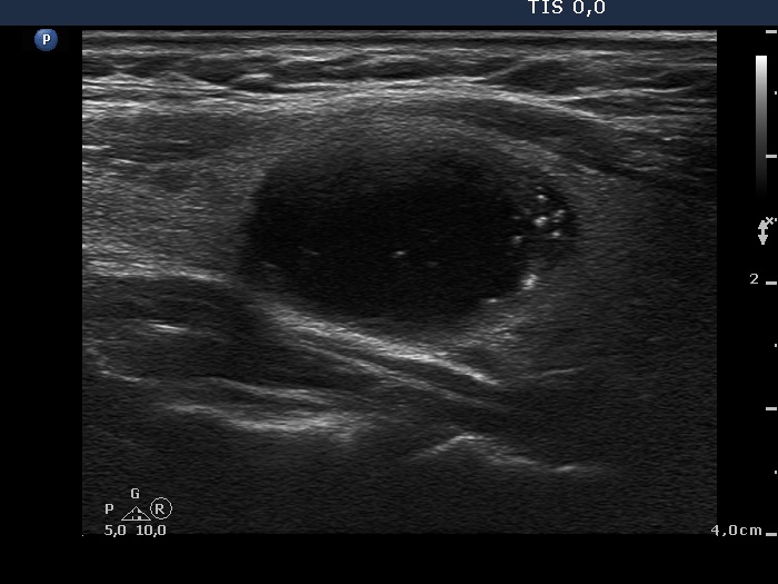 At first sight, this pattern mimics the starry sky phenomenon which would be caused by numerous microcalcifications. However, these granules are found in a cystic fluid therefore they cannot be punctate echogenic foci (microcalcifications).