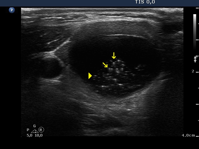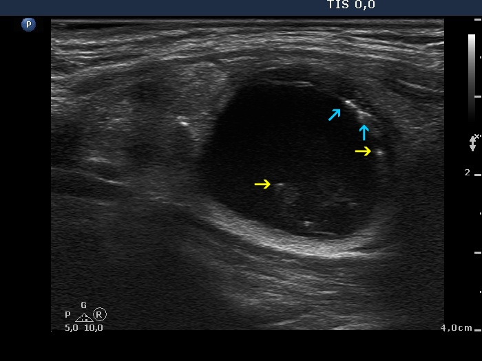 There are several unambiguous figures with typical presentation (yellow arrows), while several hyperechogenic granules lack dorsal acoustic shadow (white double arrows) which theoretically might be punctate echogenic foci. On the other hand, in the presence of typical comet-tail artifacts, similarly bright non-typical forms more likely belong to the same category. Moreover, punctate echogenic foci (microcalcifications) cannot be found in cystic fluid.