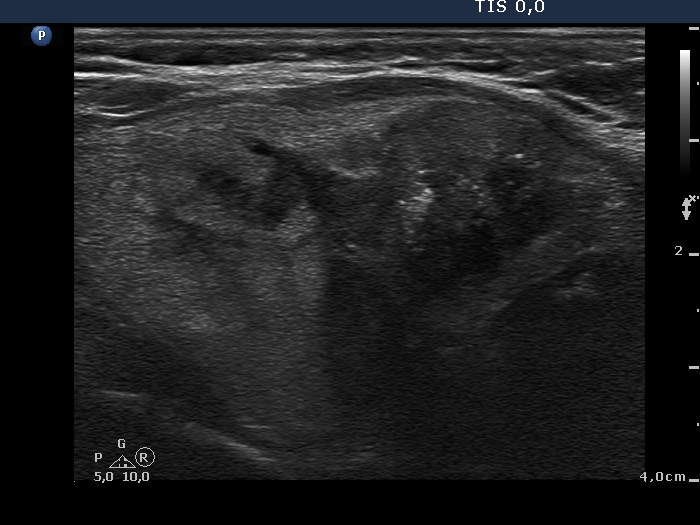 This is a compound figure, an irregular patch located within a hypoechogenic nodule. The patch is composed of an echonormal irregular mass which usually contains hyperechogenic granules, punctate echogenic foci and/or coarse calcifications, as well. Every third medullary carcinoma presents this figure. Similar figures can be found even in benign lesions.