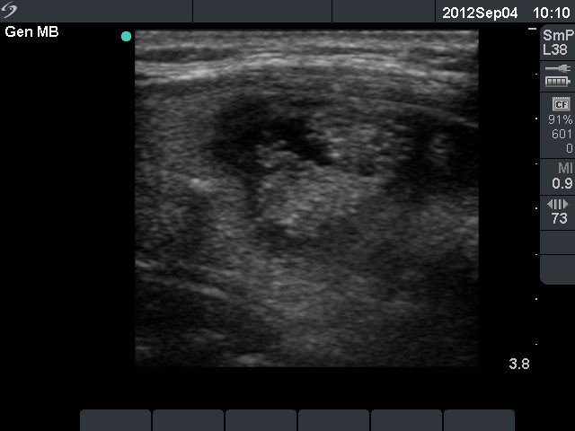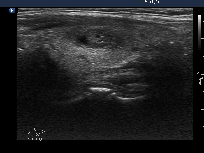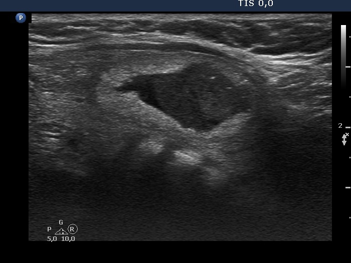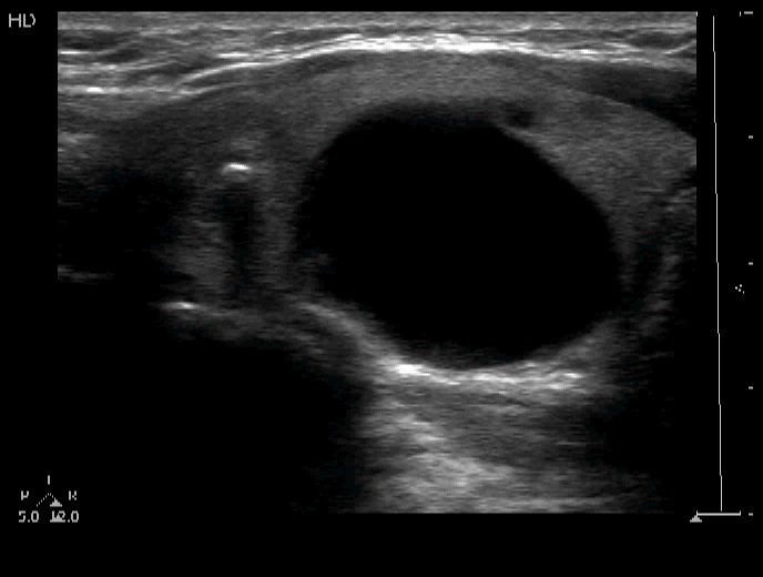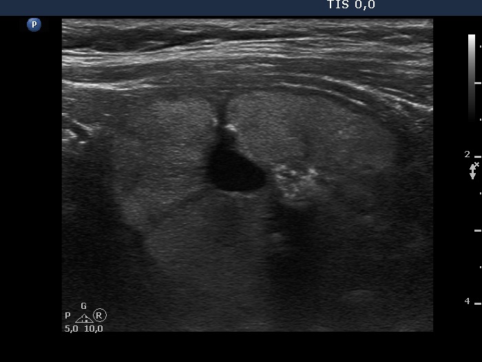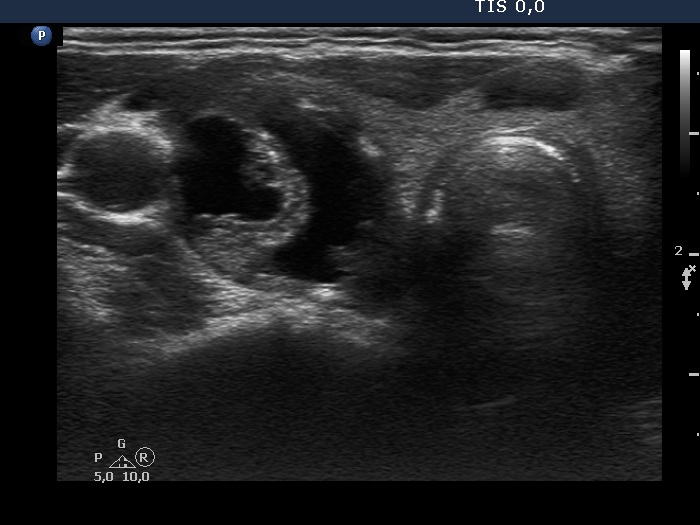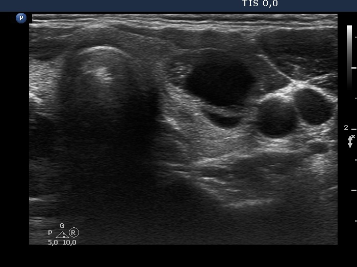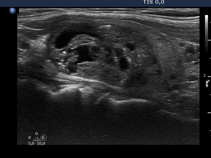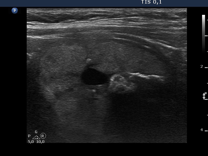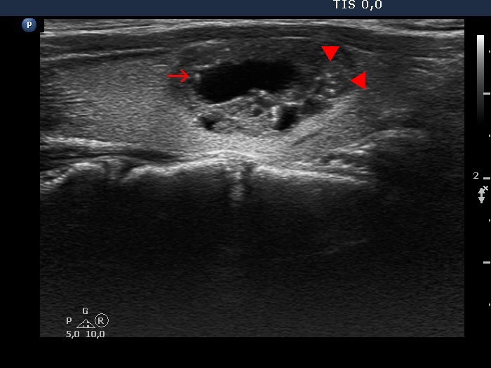 It is evident that a hyperechogenic figure in the cystic area has no oncological significance. The issue is the interpretation of granules within the solid part of a mixed lesion and within solid nodules. A colloid crystal might appear in the latter, as well and the presentation is less typical because of optical reasons: the typical tail is much better visualized in a fluid than in a solid area.
