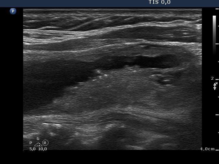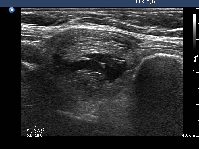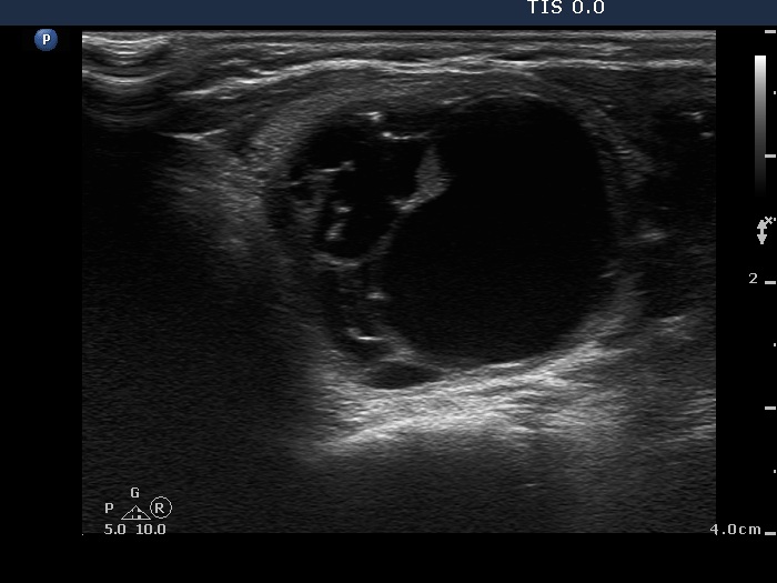 This is the only figure which is virtual and is an optical artifact caused by the enhancement of the ultrasound dorsal to the cystic fluid. It appears in the back wall of cystic areas or even just dorsal to the wall in the parenchyma. If it appears as a linear figure we have no problem. However, hyperechogenic granules might be misinterpreted as punctate echogenic foci (microcalcifications).