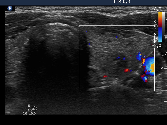 Left lobe, horizontal scan, color Doppler mode. The hypoechogenic area displays signs of intralesional blood flow.