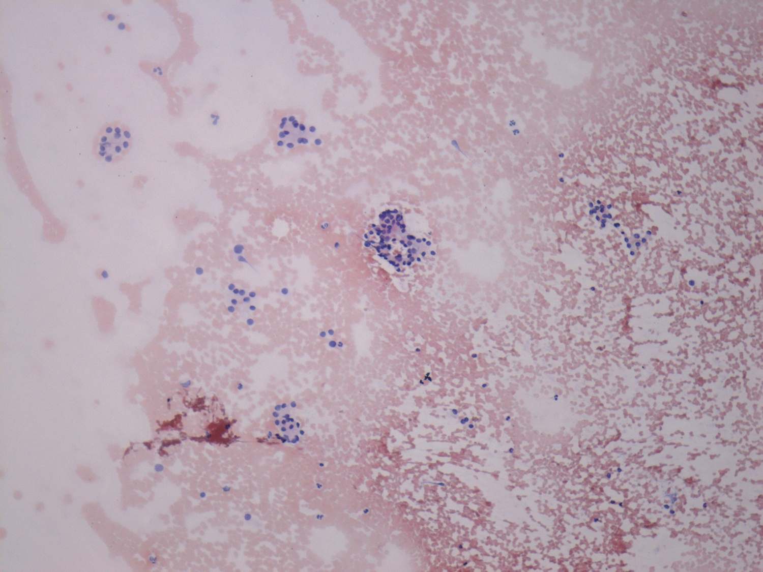 Pap-smear, 100x. There is no colloid in the background. Follicular cells occur predominantly in micro- and normofollicles.