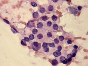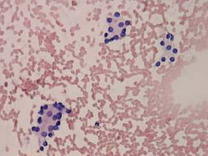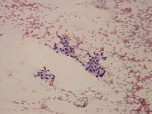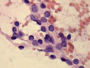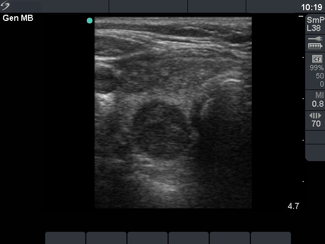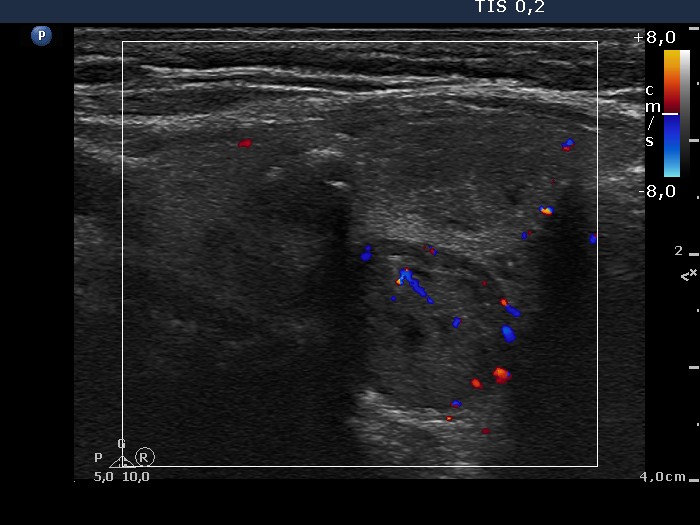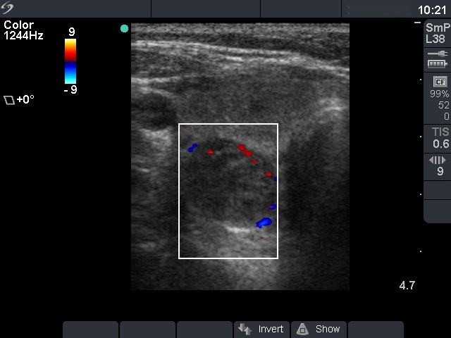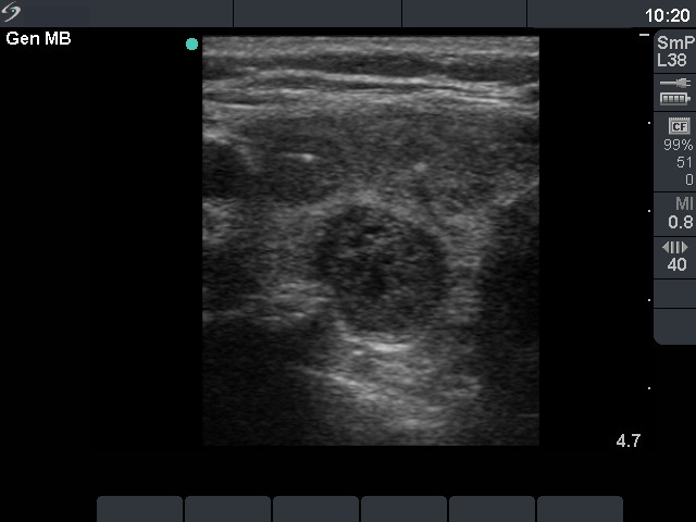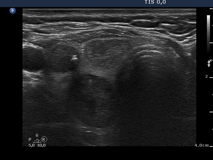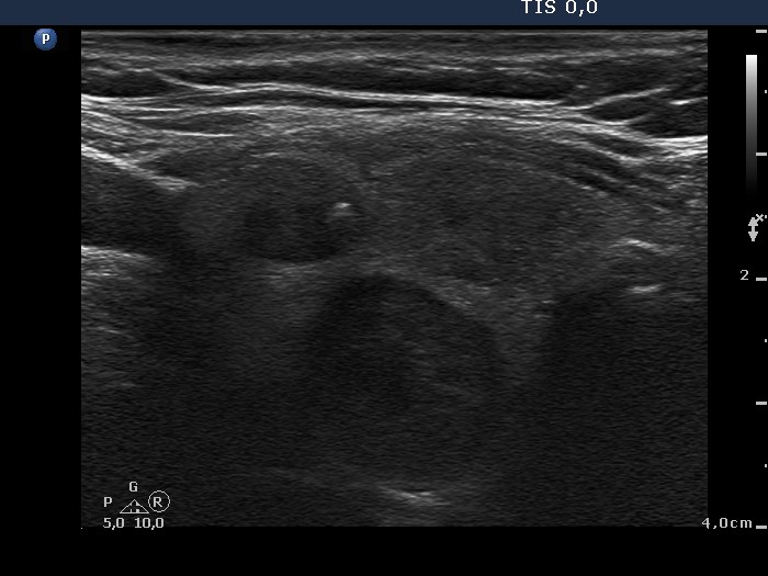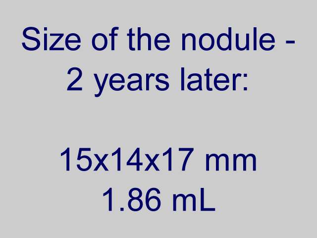 Cytology was performed from the dorsal, hypoechogenic nodule and resulted in benign, follicular proliferation. The risk of a carcinoma was estimated to be less than 1%.
