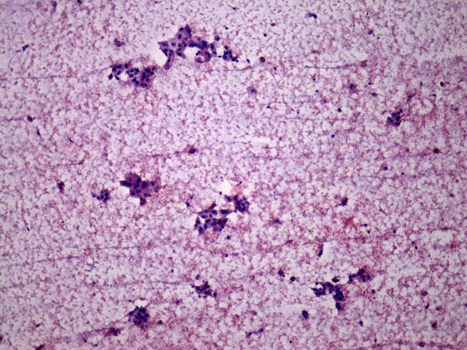 Pap-smear, 100x. Follicular cells in non-specific clusters and dissociated.