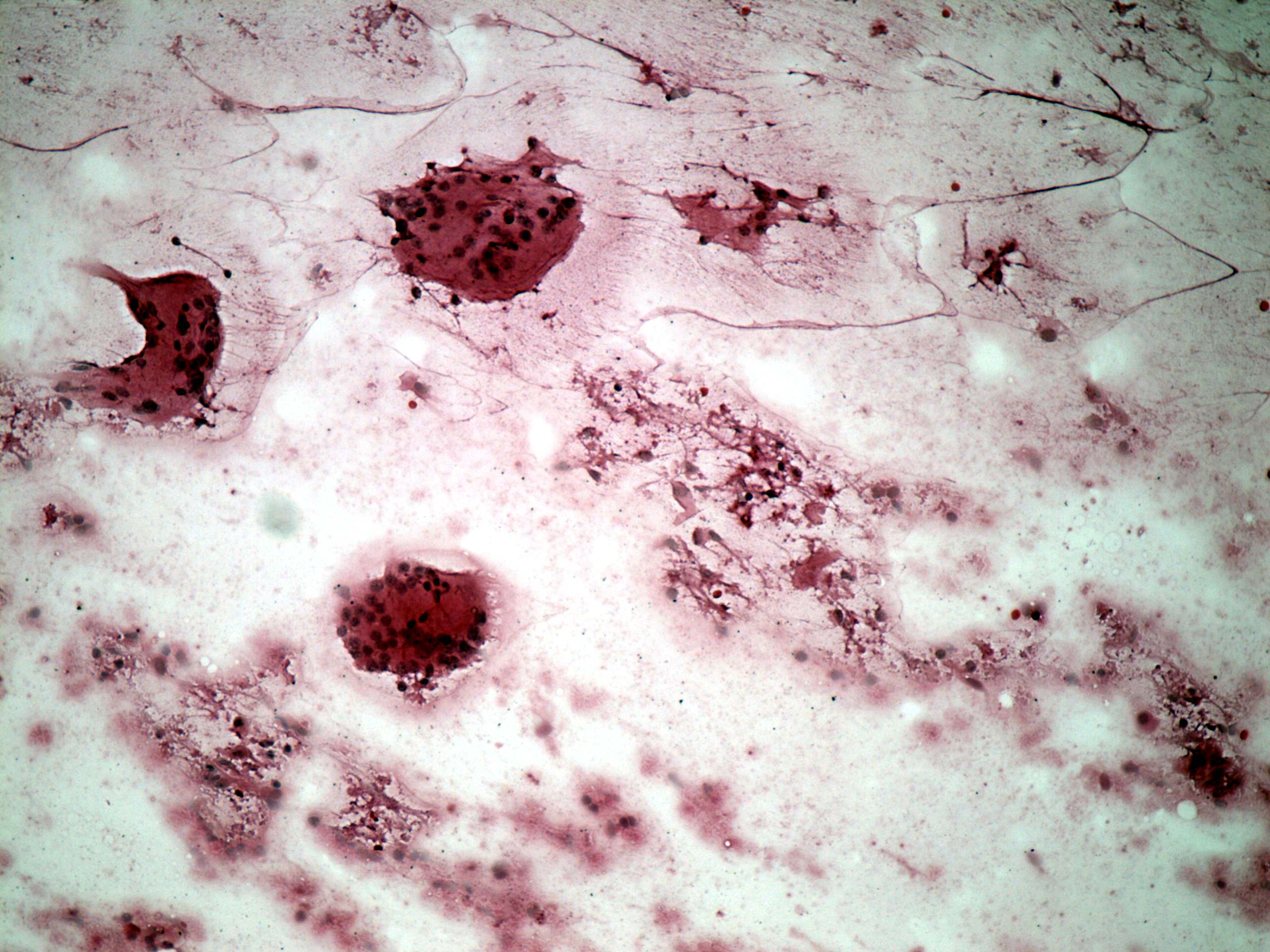 Pap-smear, 100x. There is no colloid in the background. There are several multinucleated cells and severely degenerated isolated nuclei.