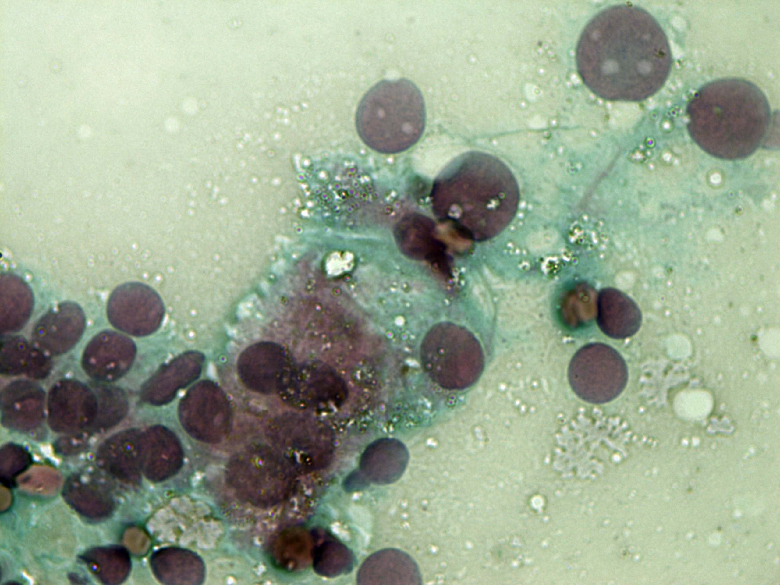 Pap-smear, 1000x. The intranuclear light round figures does not fulfill the criteria of a true pseudoinclusion.