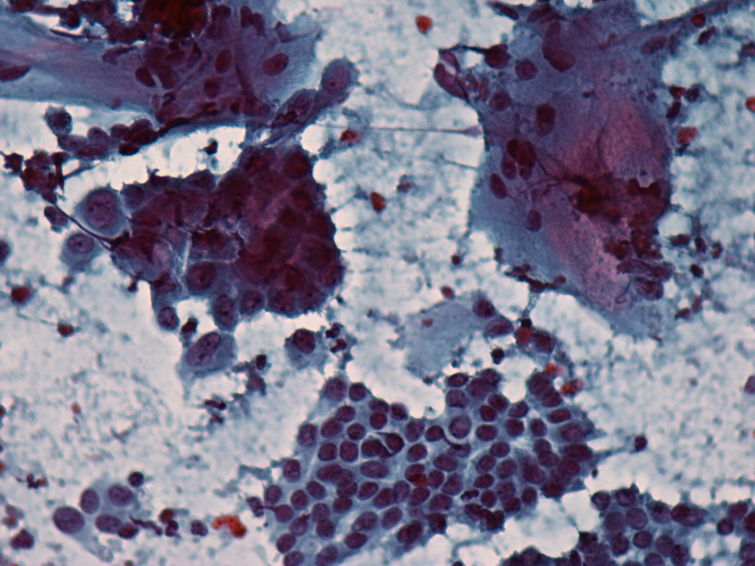 Pap-smear, 400x. There are different cell populations in the image. The lower monolayered sheet is composed of regular follicular cells, while upper and left to this cluster there is a group composed of enlarged thyrocytes with irregular chromatin structure. Note the presence of two multinucleated cells in the upper part of the image.