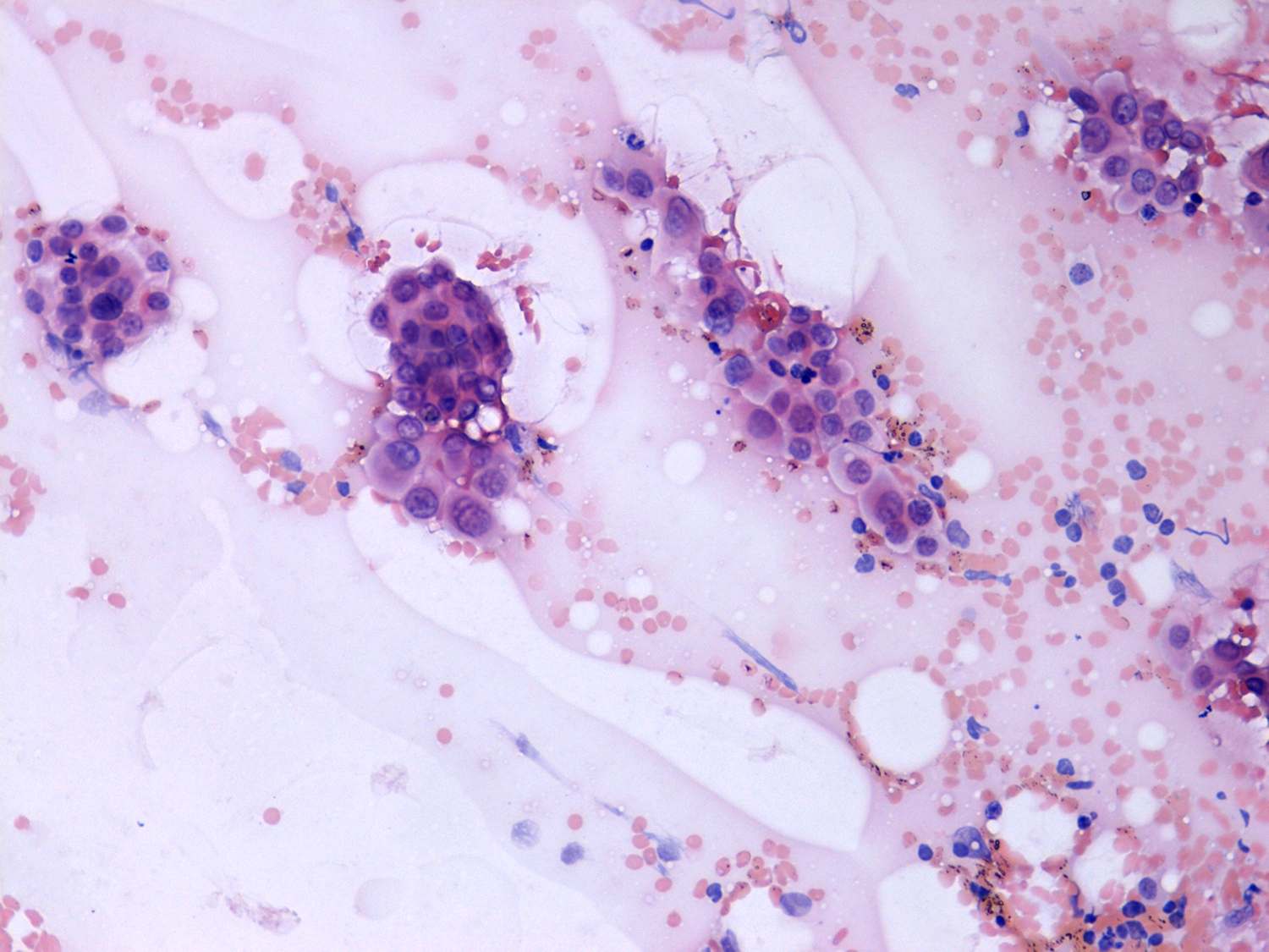 Pap-smear, 200x. Note the irregular chromatin structure and the presence of inclusions.