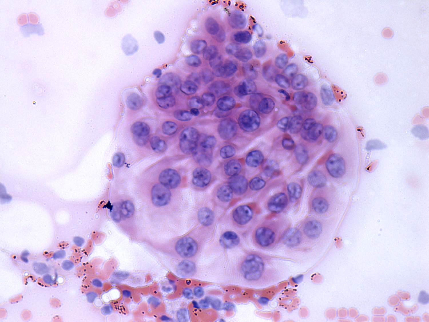 Pap-smear, 400x. Follicular cells exhibit prominent nucleoli. Note the presence of grooves.
