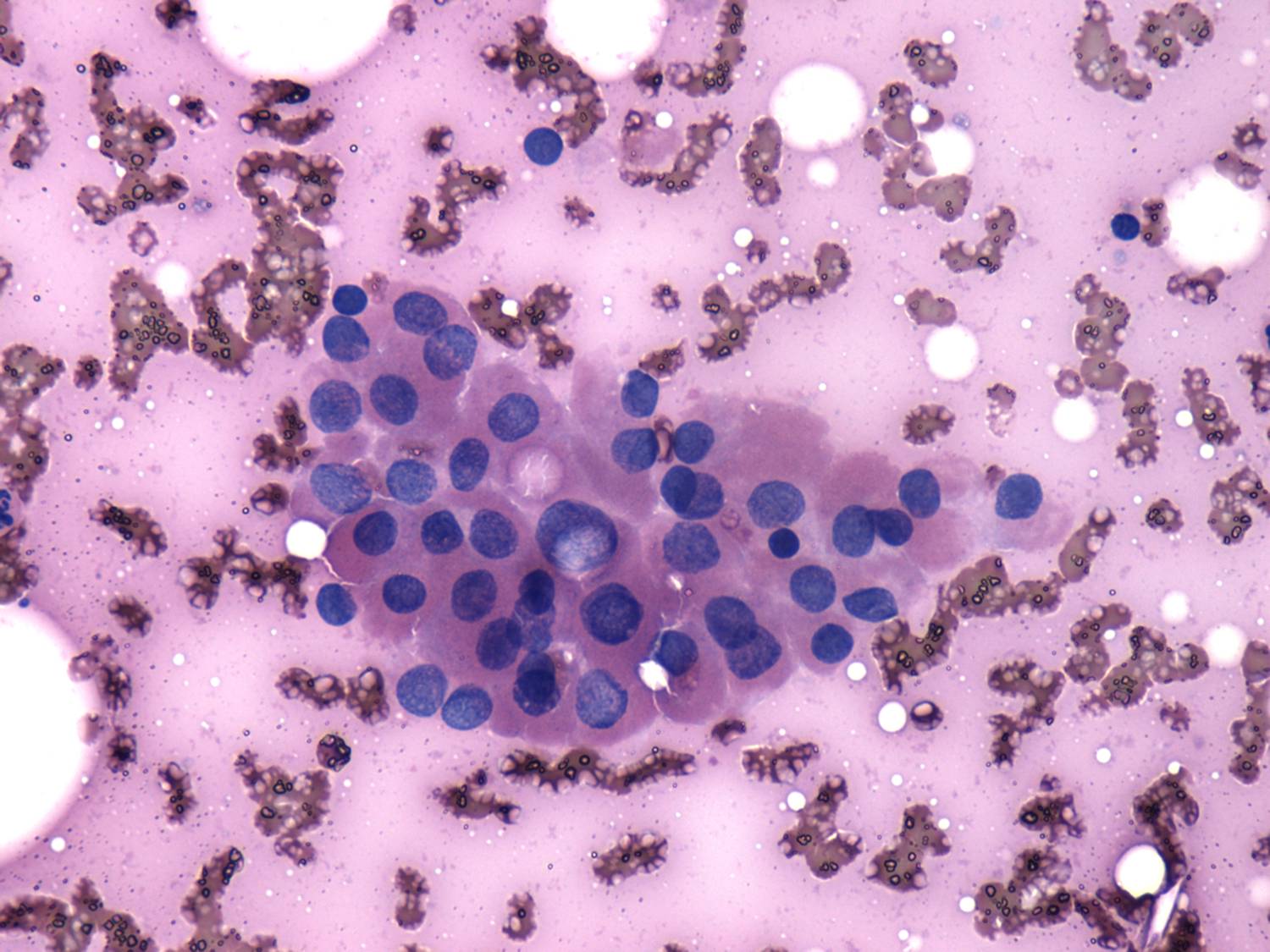 Pap-smear, 400x. Follicular cells display oxyphilic metaplasia.