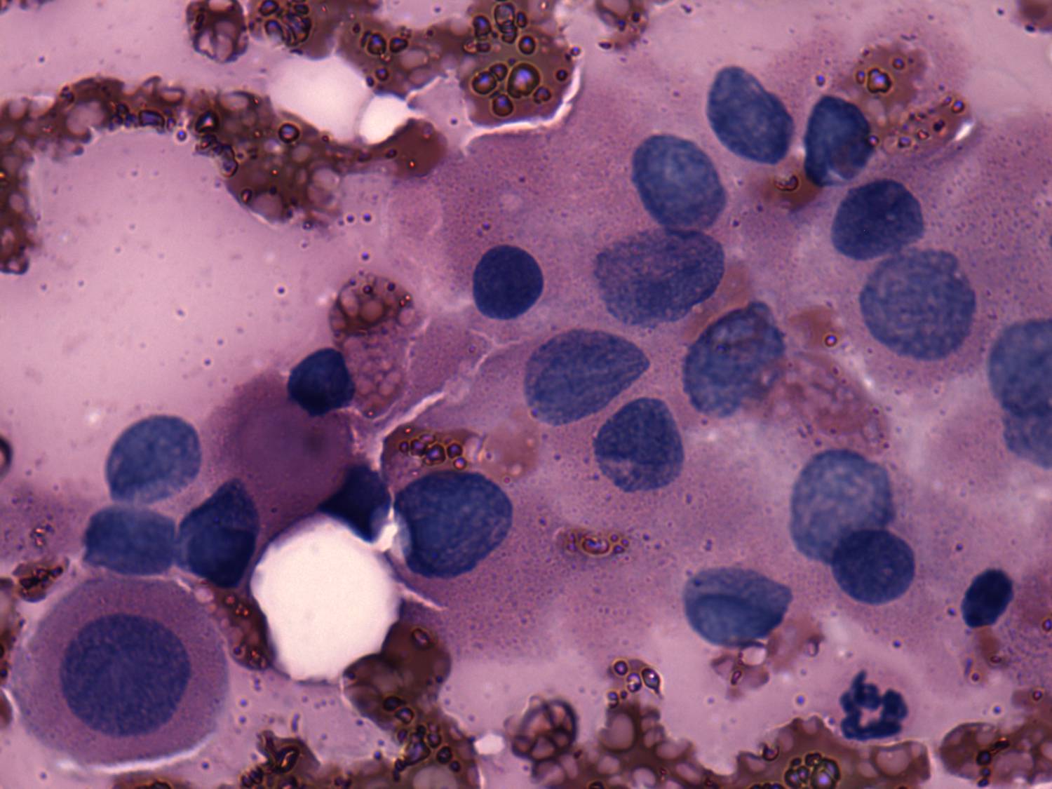 Pap-smear, 1000x. The chromatin structure is blunt. Note the presence of three lymphocytes.