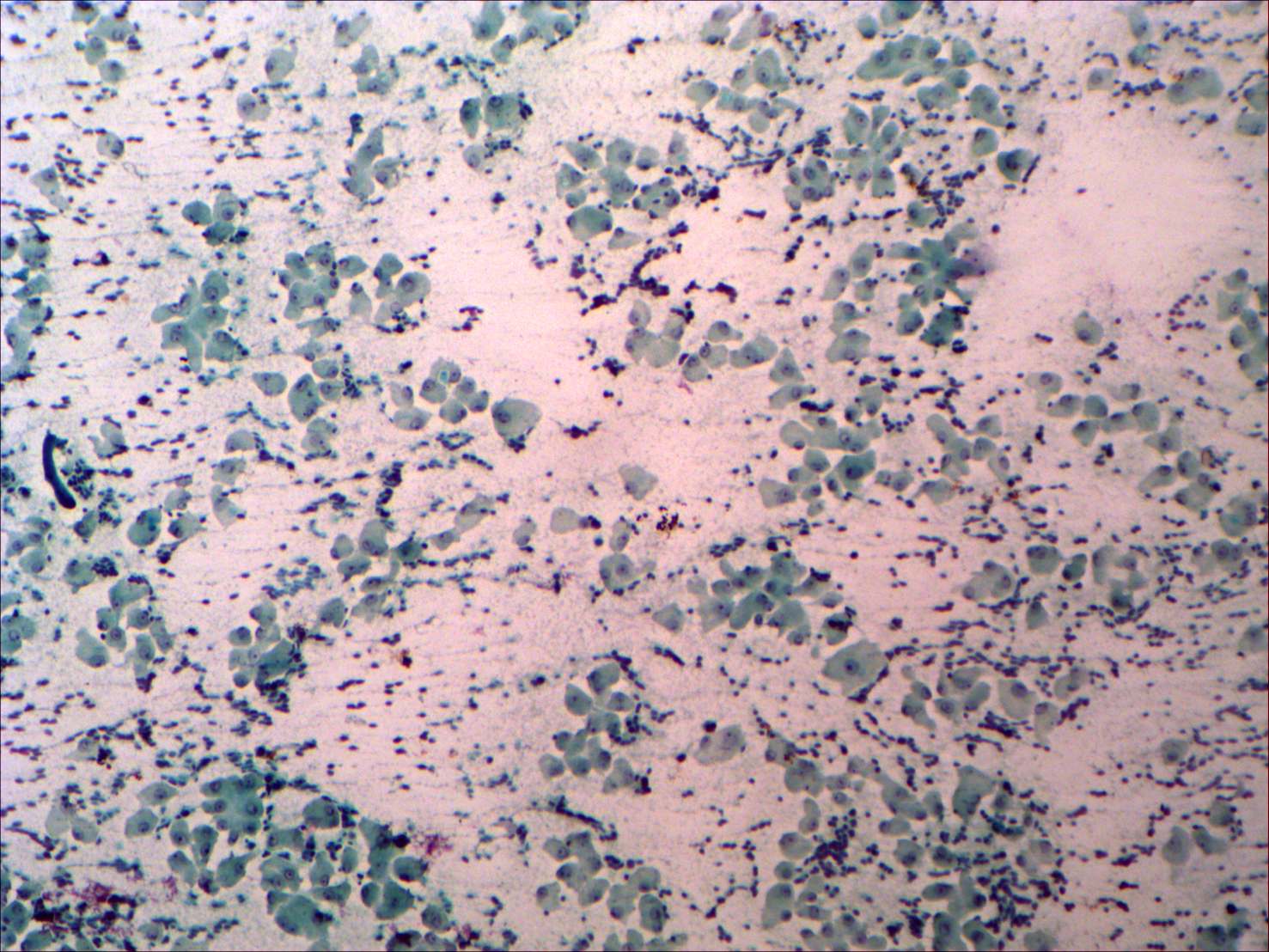 Pap-smear, 100x. There is no colloid in the background. Follicular cells with abundant cytoplasm are dispersed.