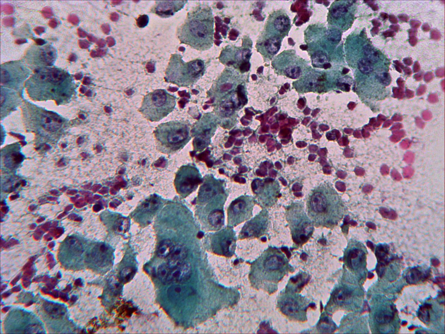 Pap-smear, 400x. Oxyphilic metaplasia, i.e. follicular cells have abundant, finely granular cytoplasm.