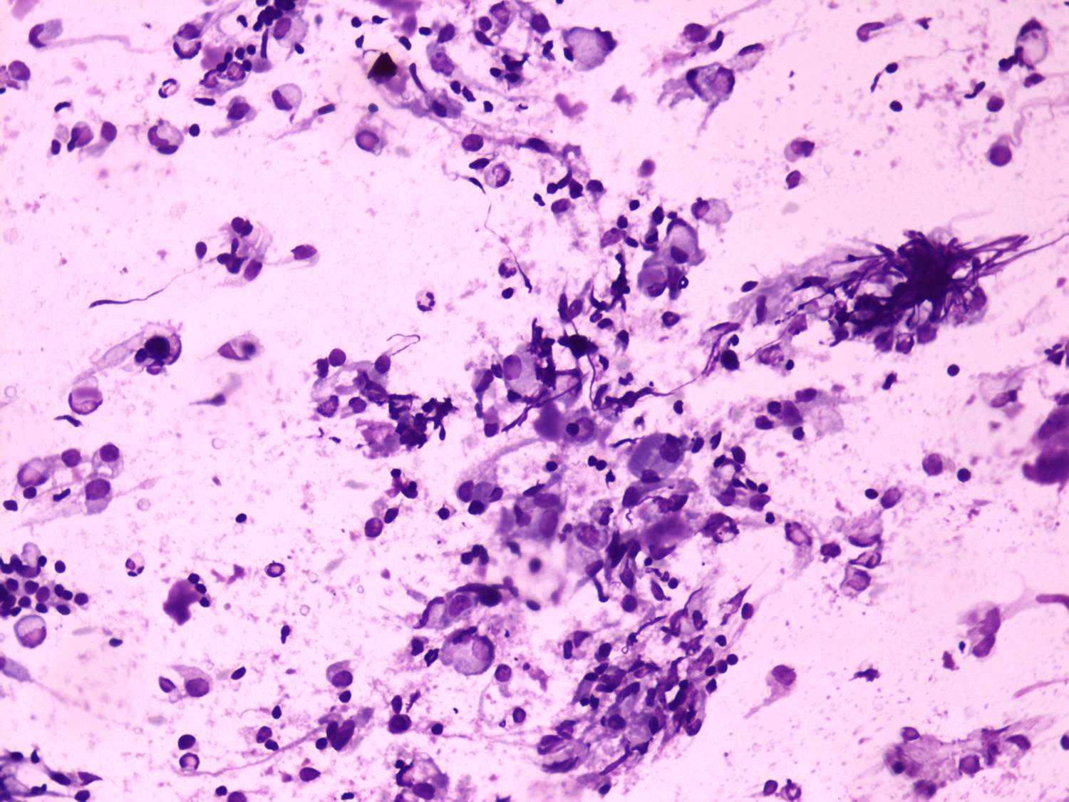 Wright-Giemsa staining, 400x. Inflammatory cells, necrotic fragments and follicular cells are presented.