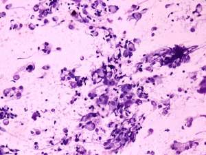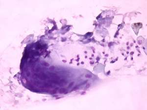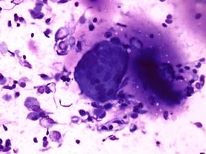 Cytological diagnosis: subacute, granulomatous de Quervain's thyroiditis.