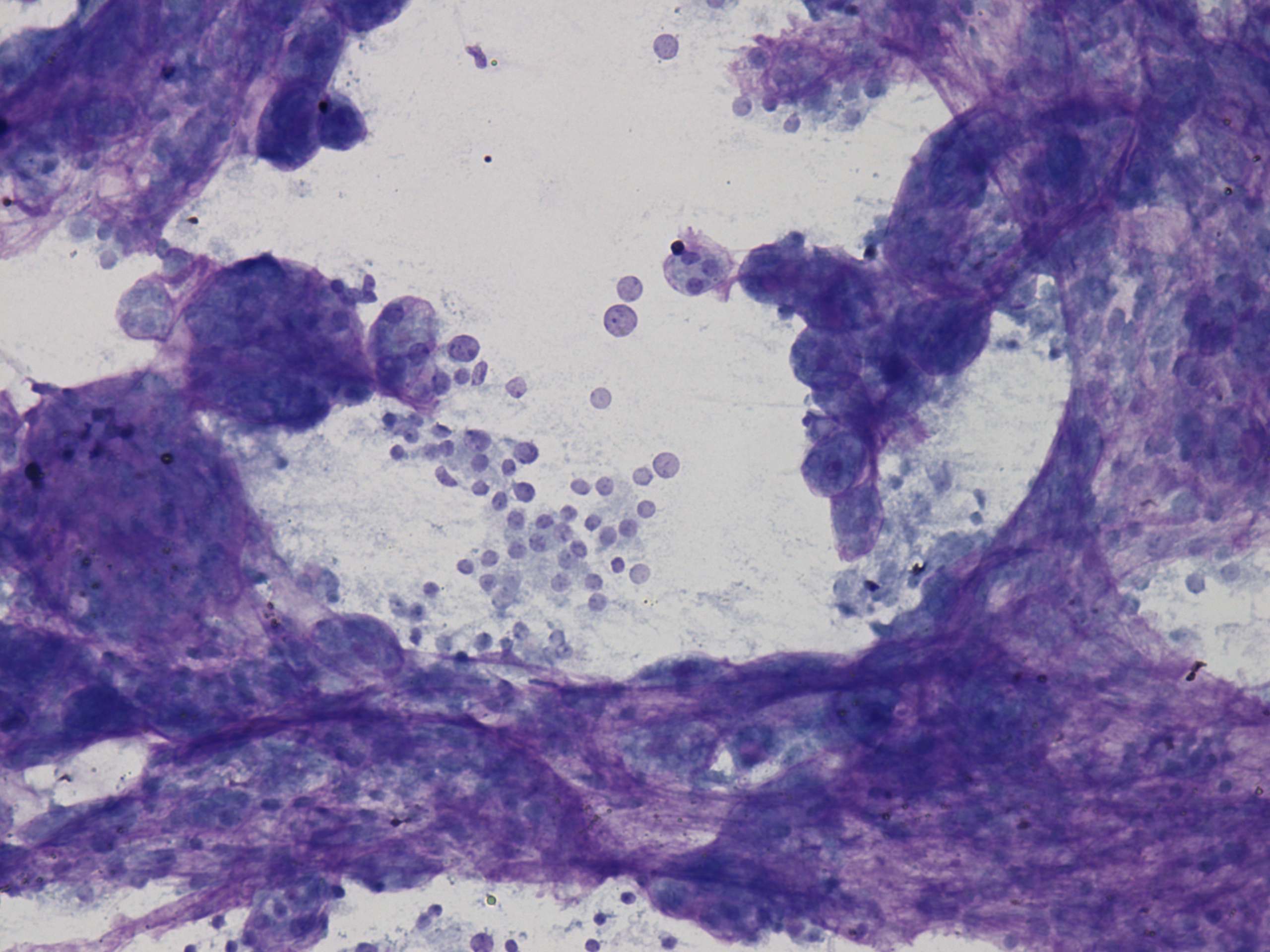 Wright-Giemsa staining, 200x. The papillary cell groups are composed of cell balls characteristic of hyperplastic nodules.