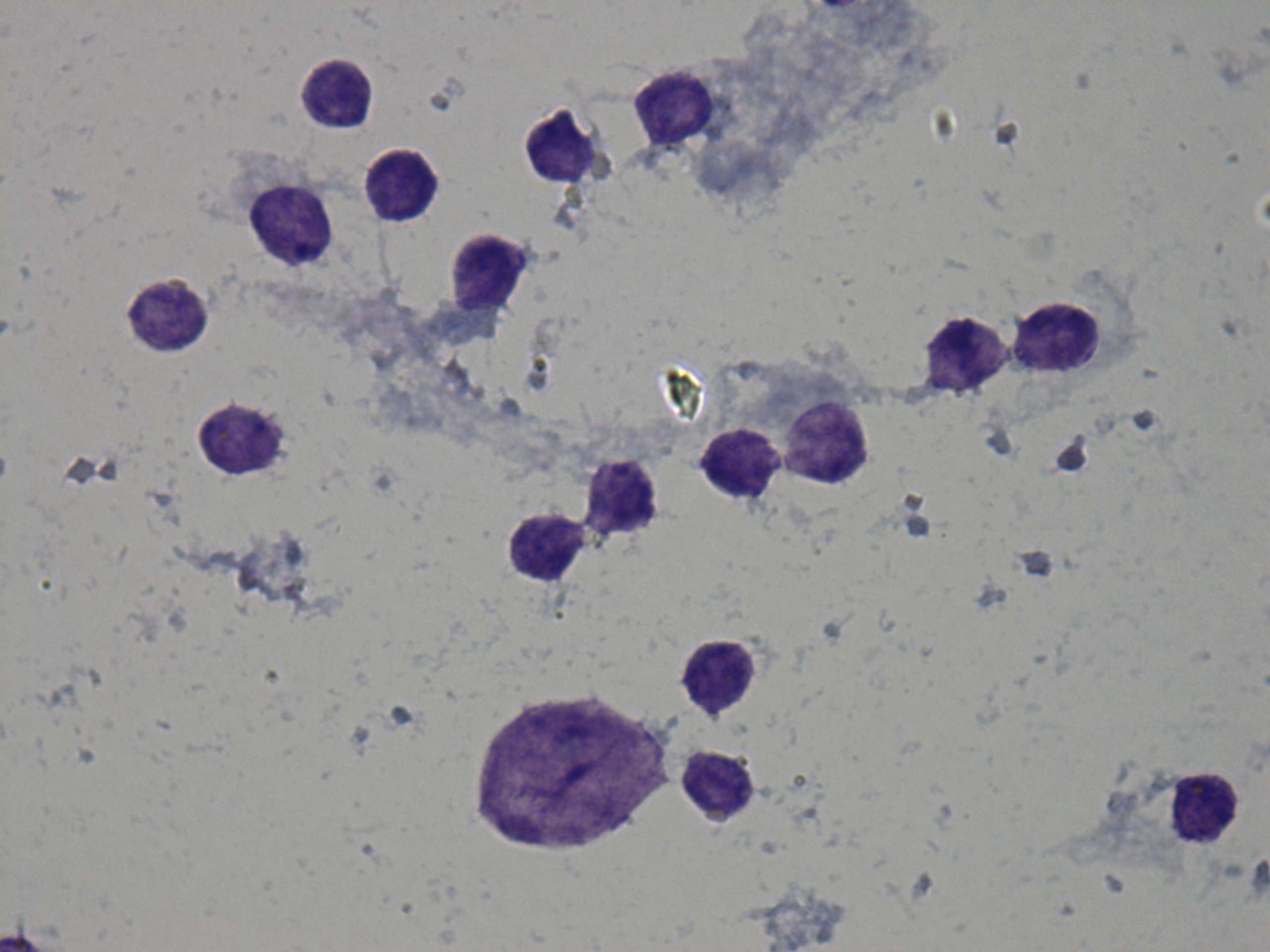 Wright-Giemsa staining, 1000x. There is an extremely enlarged nucleus. Note the lack of inclusions and grooves.