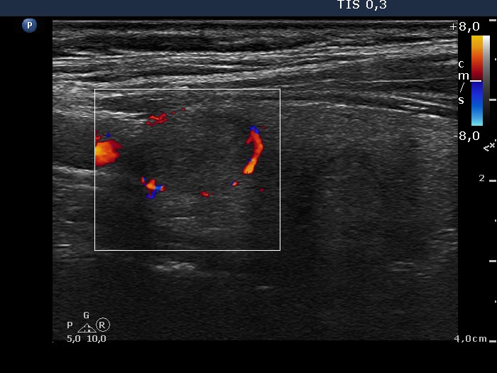 Upper part of the right lobe, longitudinal scan, color Doppler mode. The nodule in the upper part presents perinodular blood flow.