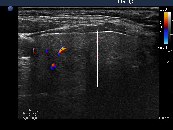 Middle-lower part of the right lobe, horizontal view, color Doppler mode. This lesion also displays signs of perinodular blood flow.