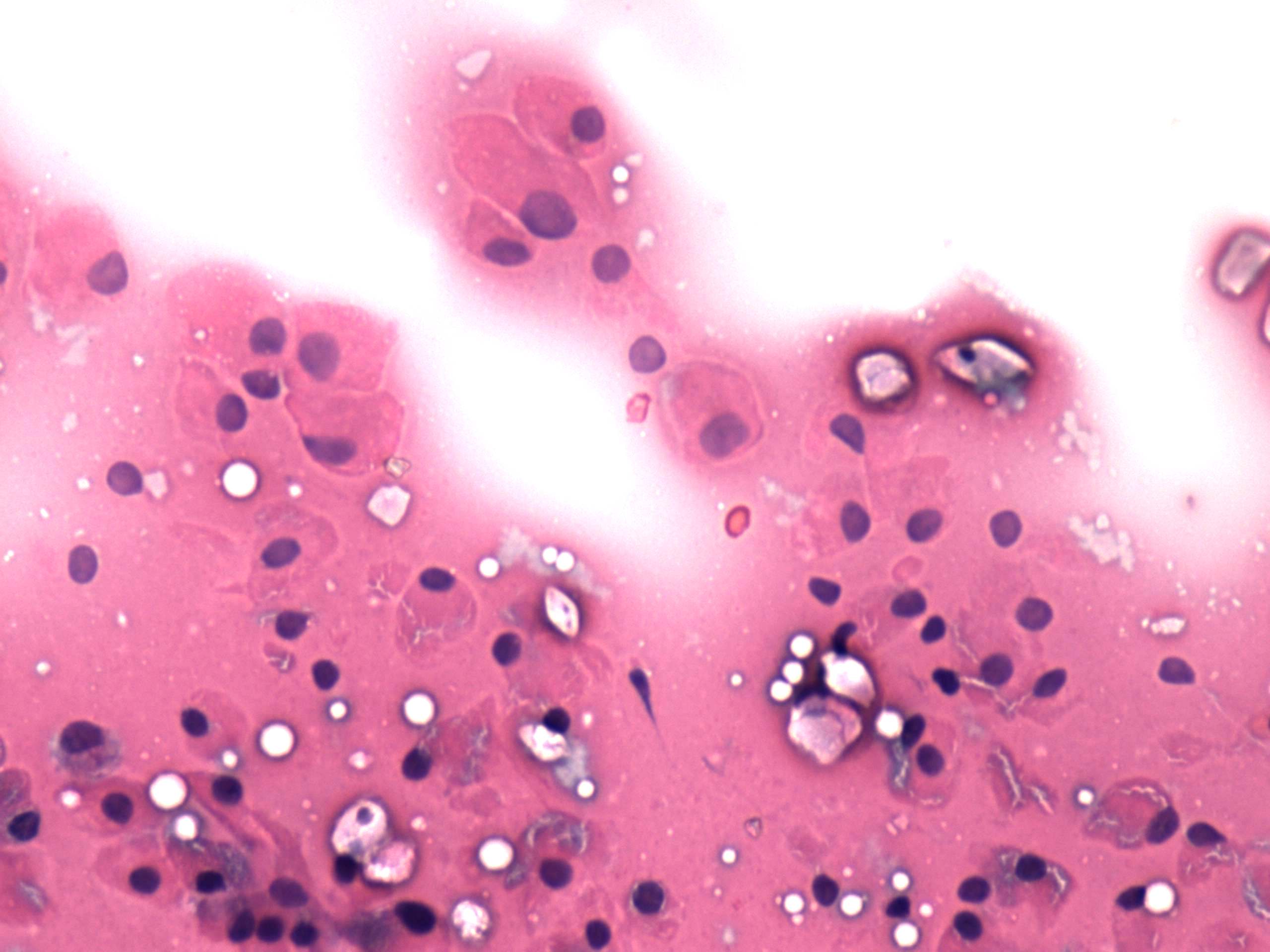 Pap-smear, 400x. Great proportion of cells presents oxyphilic metaplasia.