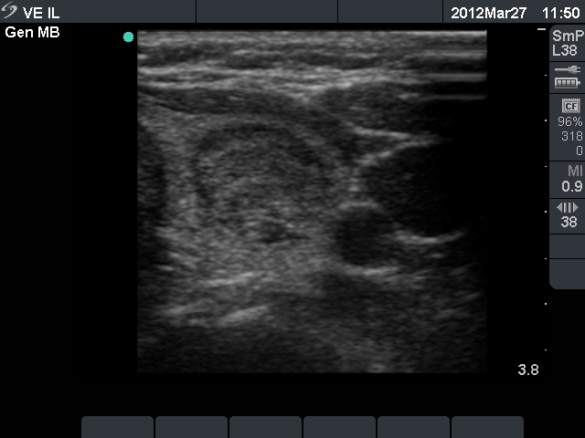 Ultrasonography: the thyroids were echonormal and contained multiple small hypoechogenic lesions. There was a mixed moderately hypoechogenic-echonormal nodule in the left lobe. The nodule exhibited a halo sign and peri- and intranodular blood flow.