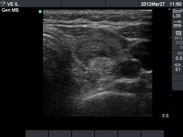 Clinical presentation: a 53-year-old woman was referred for a regular follow-up examination. She was operated on a benign nodular goiter for 19 years. She had no complaints.