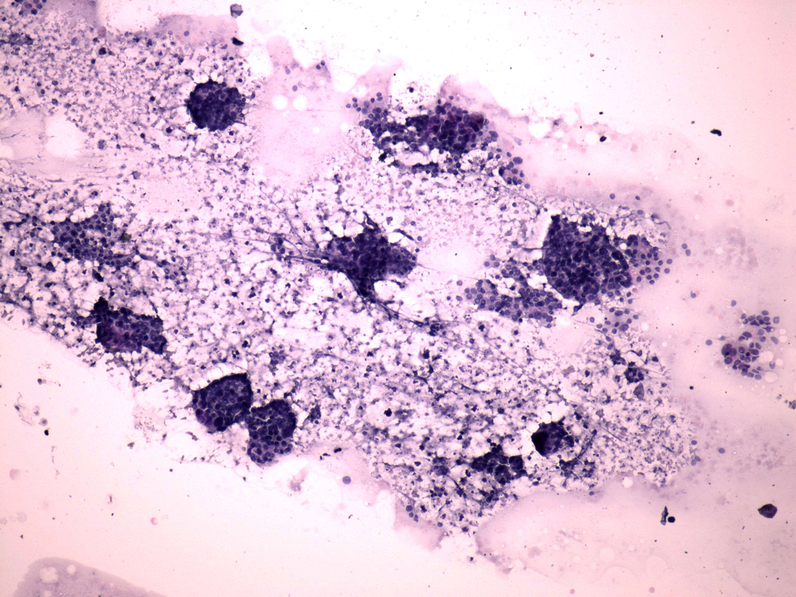 Pap-smear, 100x. There is no colloid in the background. Follicular cells are found in papillary clusters and in monolayered sheets.