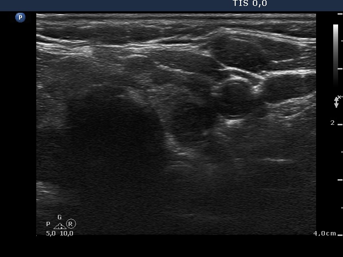 Ultrasonography: the echogenicity index is around 50% in both lobes. The circumscribed lesions are not nodules. Previous US diagnosis was multinodular goiter.