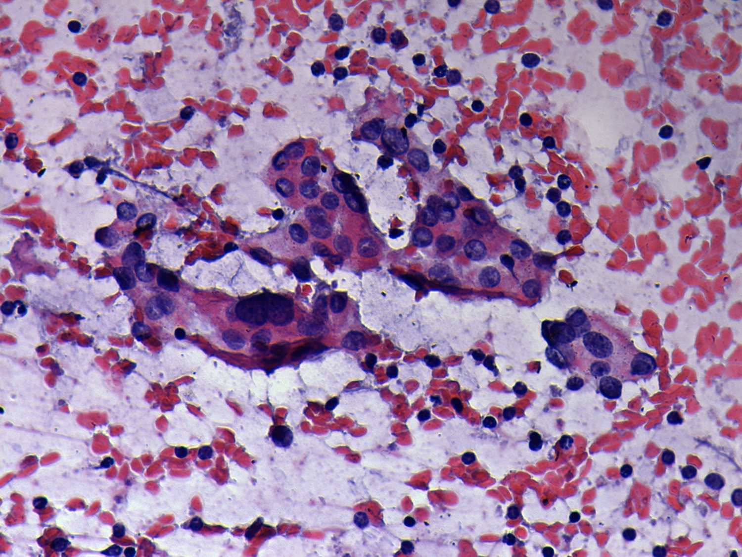 Pap-smear, 400x. Follicular cells vary in shape and size.