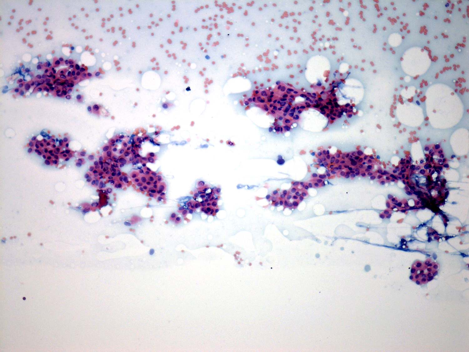 Pap-smear, 100x. Follicular cells form irregular clusters with nuclear crowding and overlapping.
