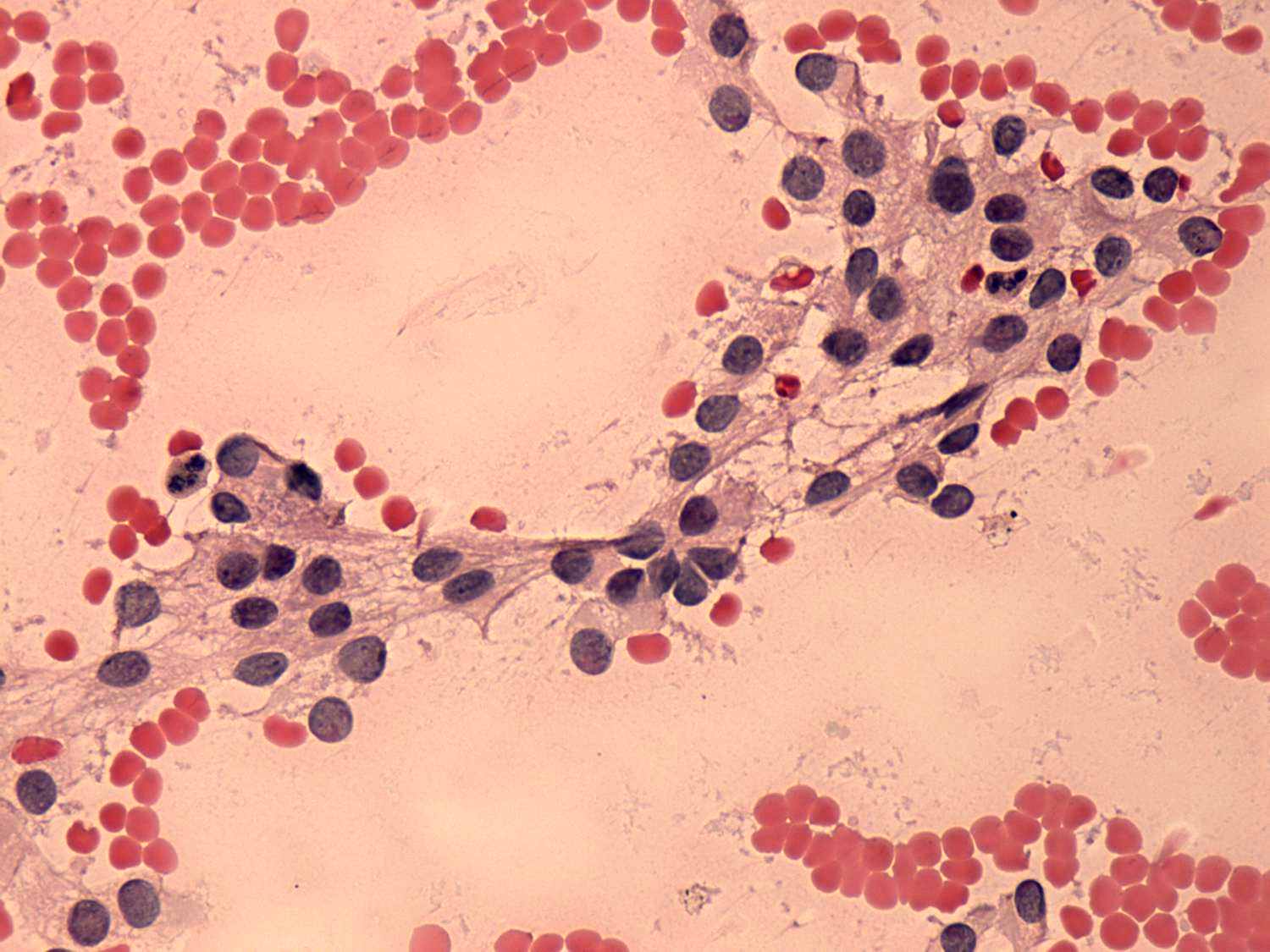 Pap-smear, 400x. A loose cluster of follicular cells with vacuolization.