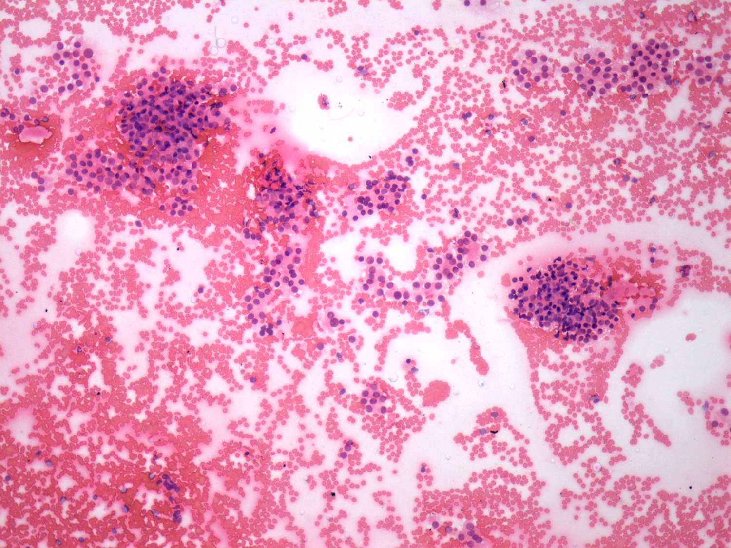 HE-staining, 100x. There is no colloid in the background. Follicular cells are in micro- and normofollicles.